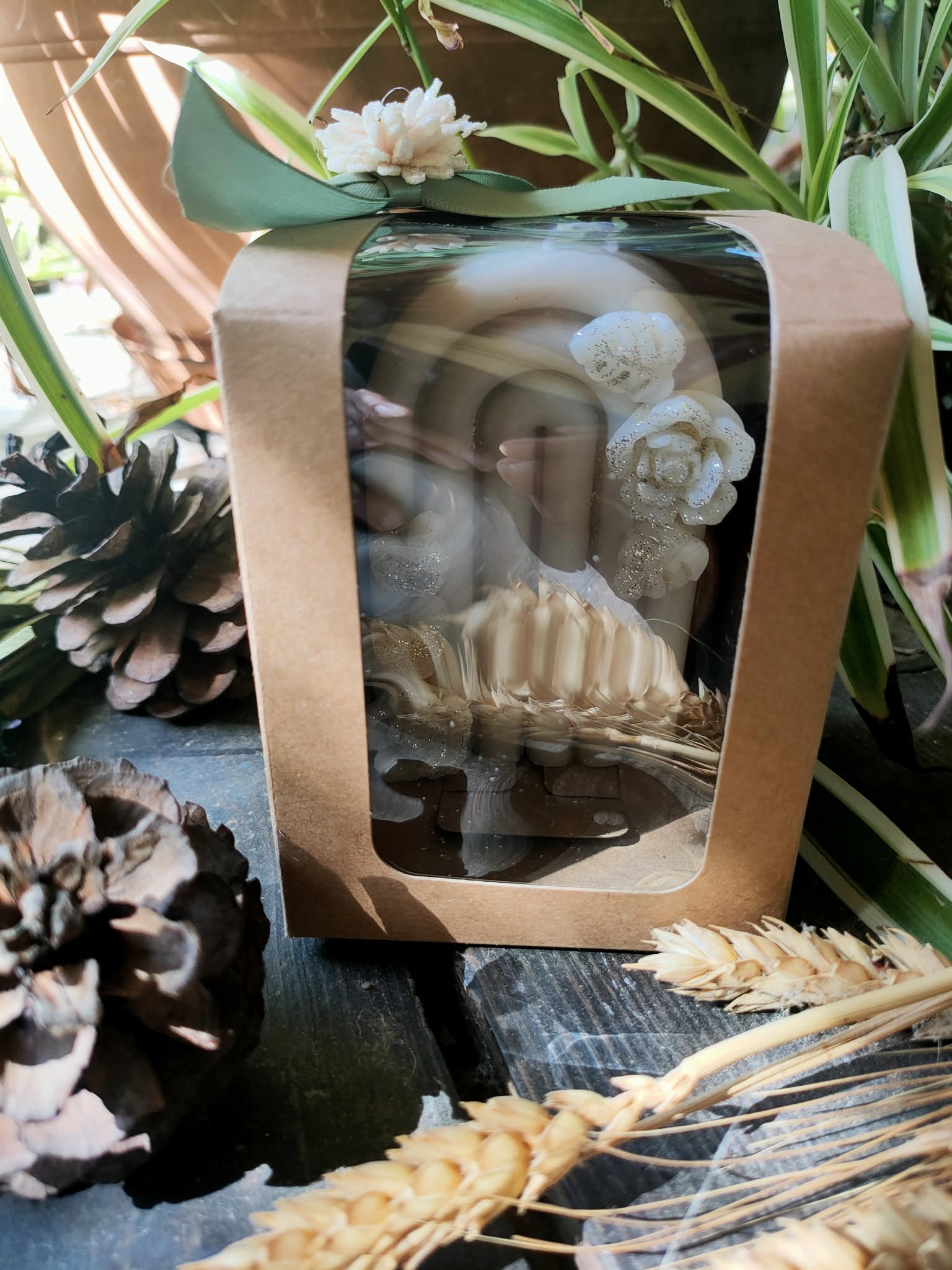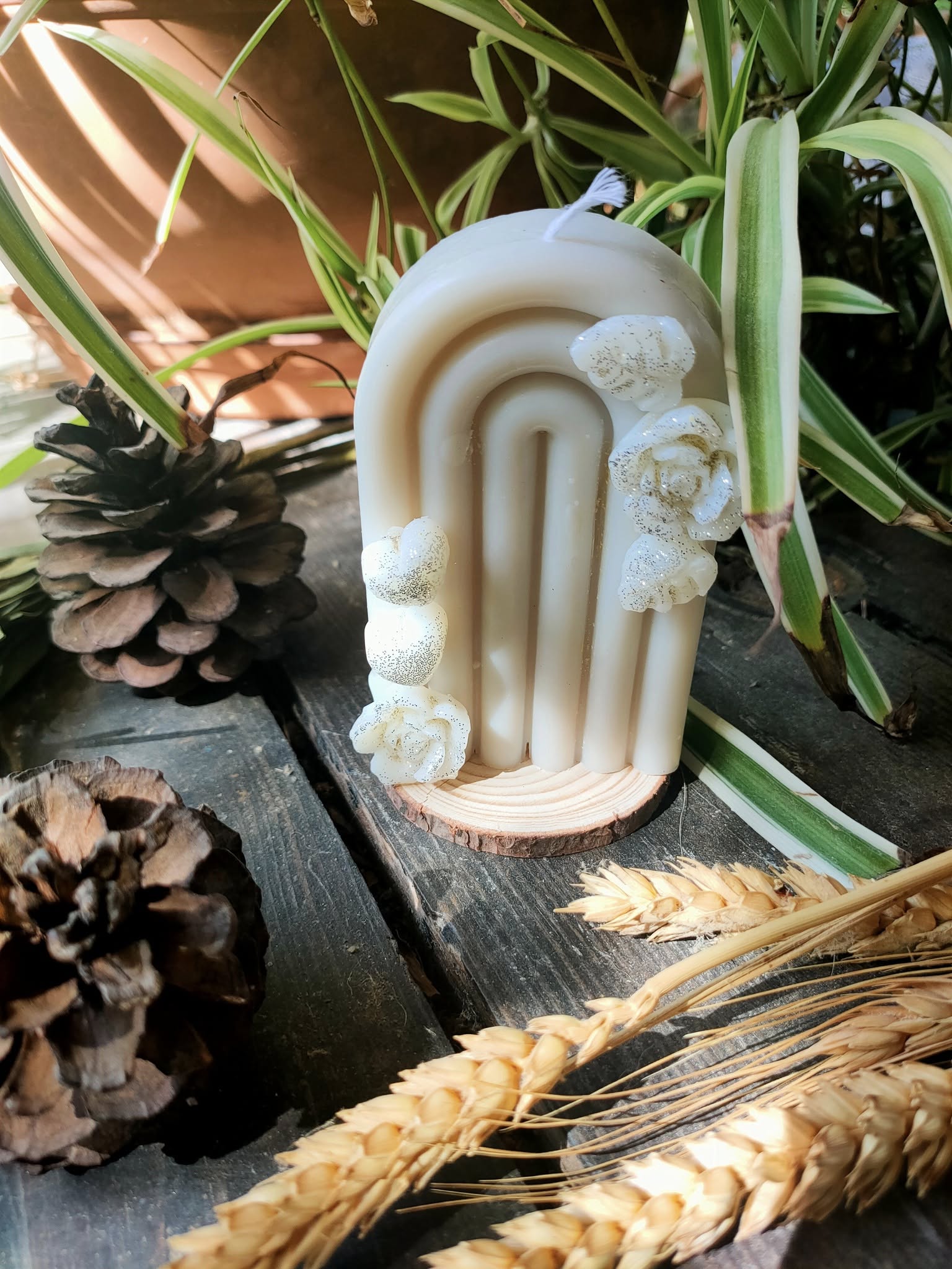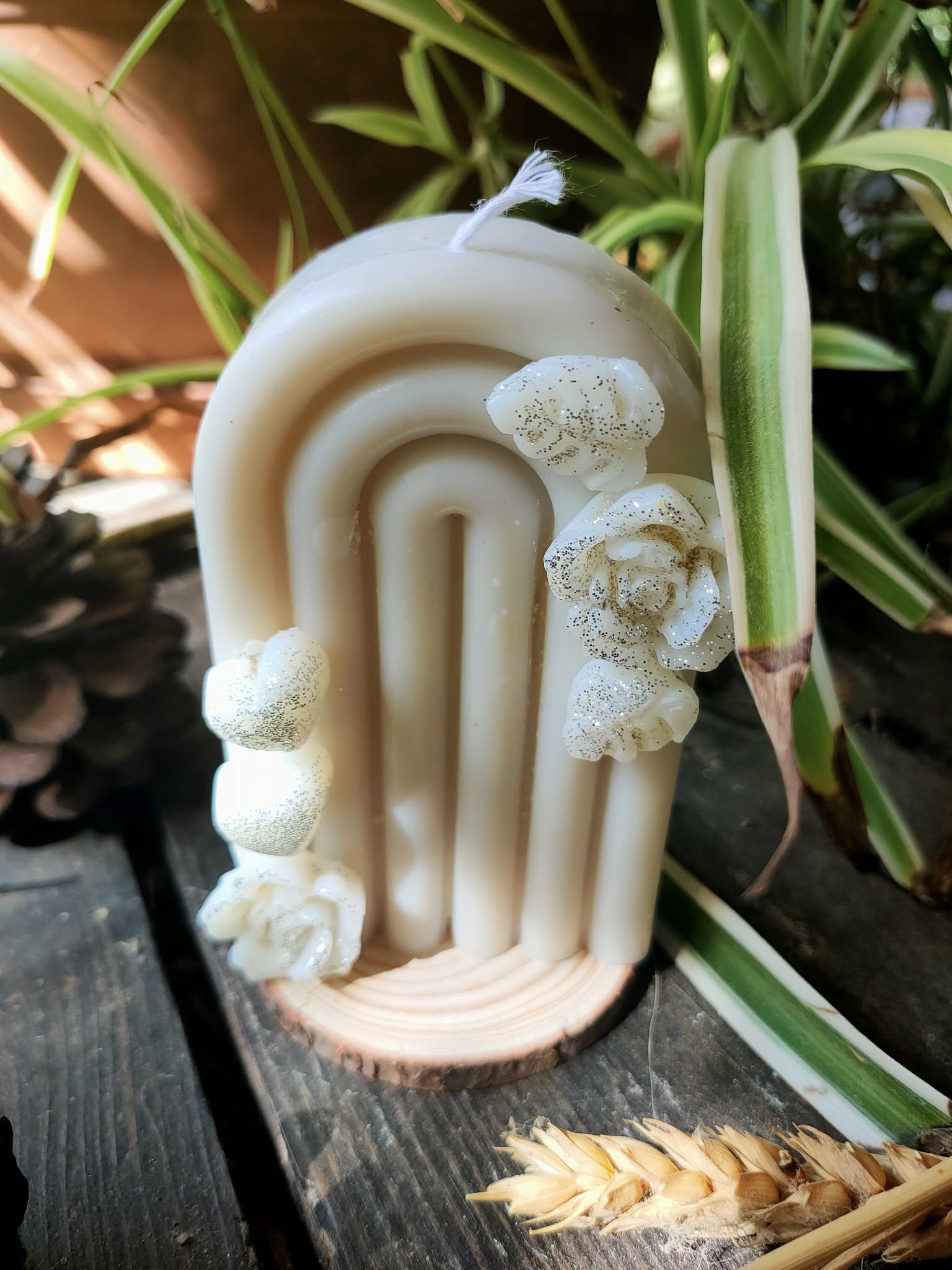 Laissez vous envouter par cette bougie en forme d'arc en ciel, décorée de petites roses et de cœur pailletés , en cire végétale, au parfum de Grasse senteur "Eclipse de lune ". Un parfum qui allie mystère et délicatesse, une expérience sensorielle unique, entre douceur nocturne et poésie étoilée inspiré par le calme d'un ciel voilé et la magie d'une éclipse.