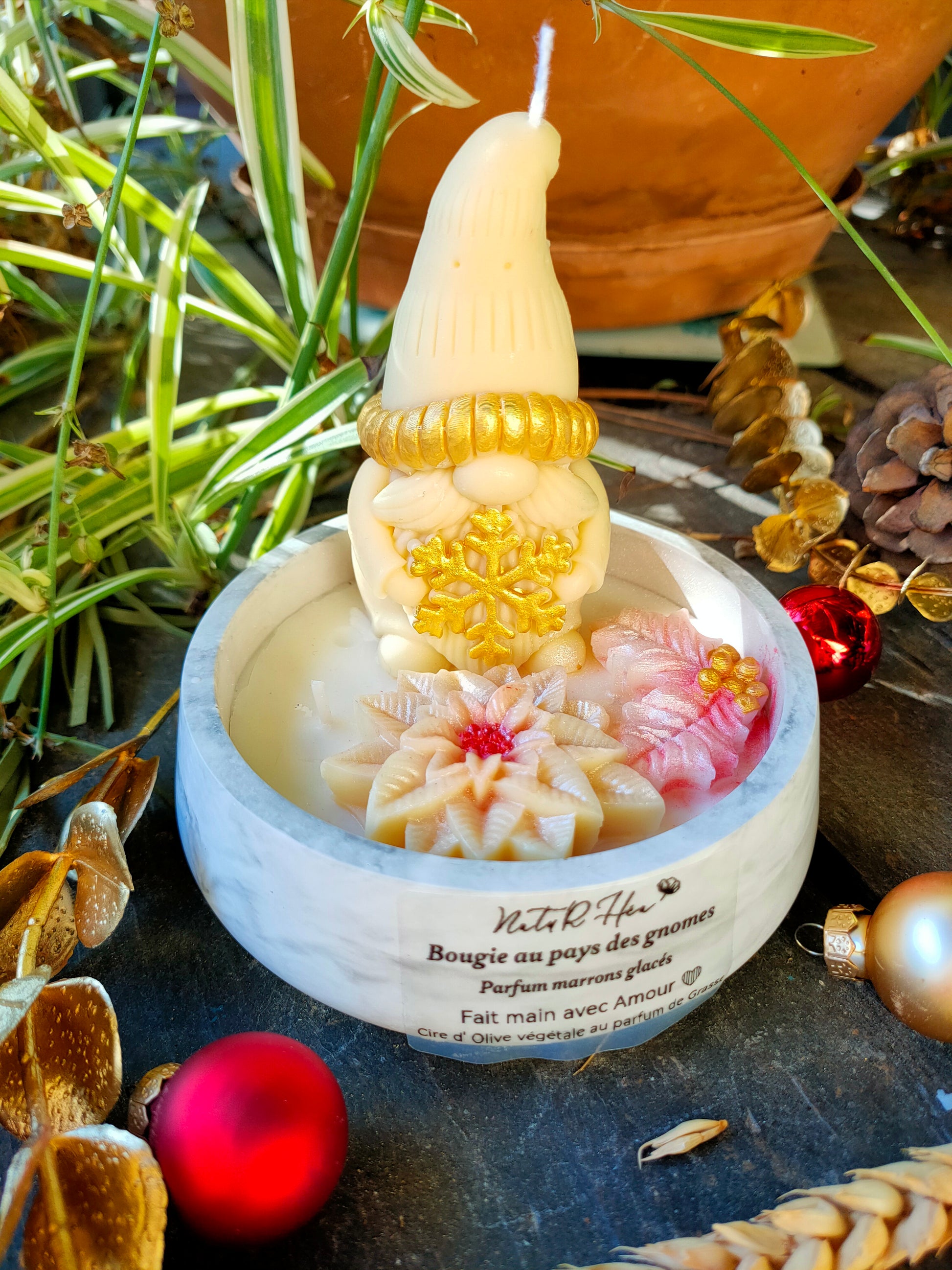 Cette bougie délicatement parfumée au marrons glacés, diffuse une senteur douce, sucrée et réconfortante qui évoque les douceurs de l'hiver. Chaque détail, du petit gnome doré aux fleurs scintillantes, est façonné avec amour pour apporter une touche magique à votre intérieur.
