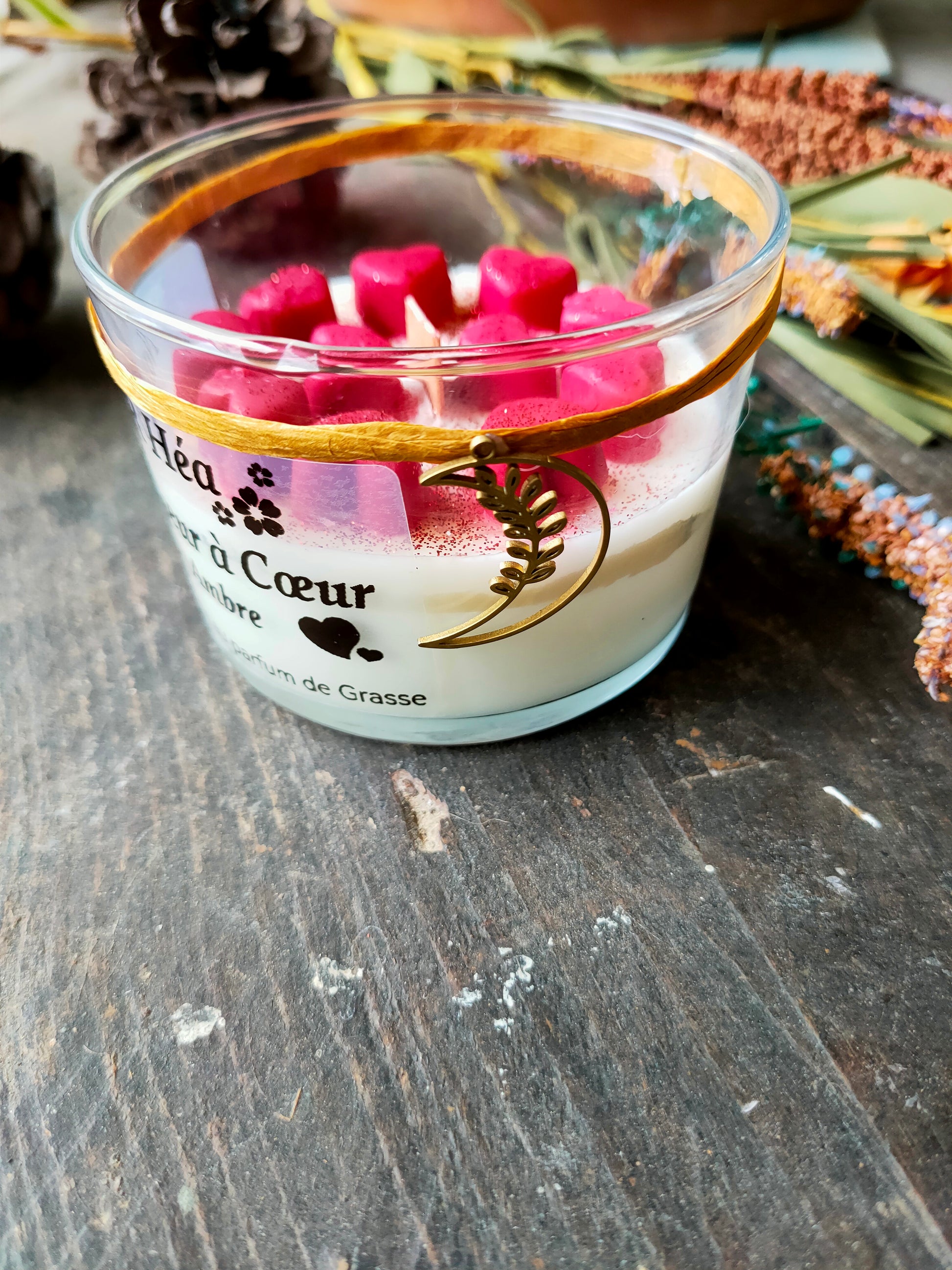 Coulée à la main en cire végétale, elle est sublimée par de petits cœurs décoratifs qui rendent chaque pièce unique.