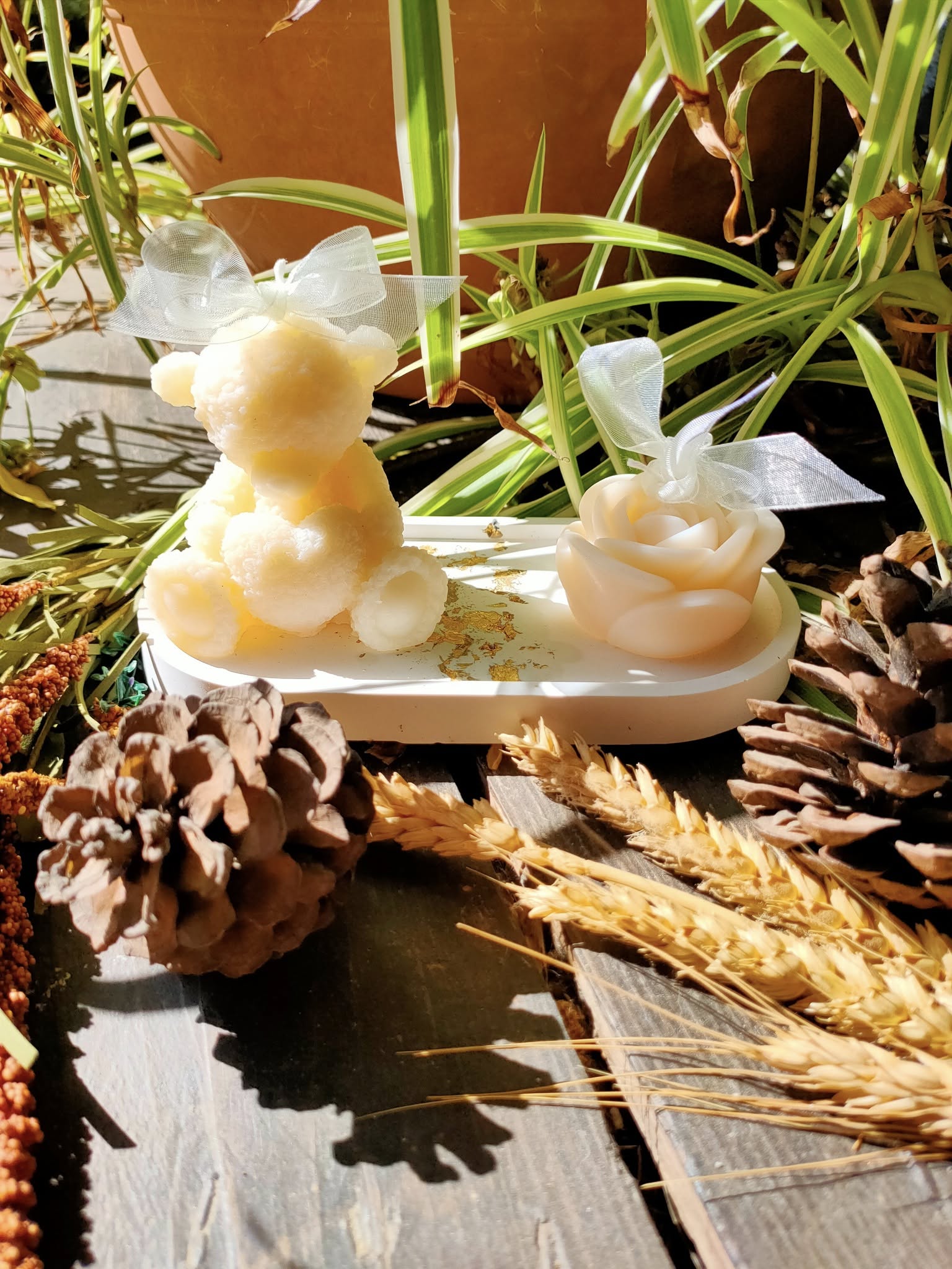 je vous présente ce joli ourson pleins de tendresse ,avec la reine des fleurs la Rose en cire végétale au parfum de Grasse senteur "sucre d'orge" posés sur un plateau en résine minérale décoré de paillettes d'or . Un retour en enfance avec cette fragrance qui éveille la gourmandise, et évoque les douceurs réconfortantes et sucrées de l'enfance