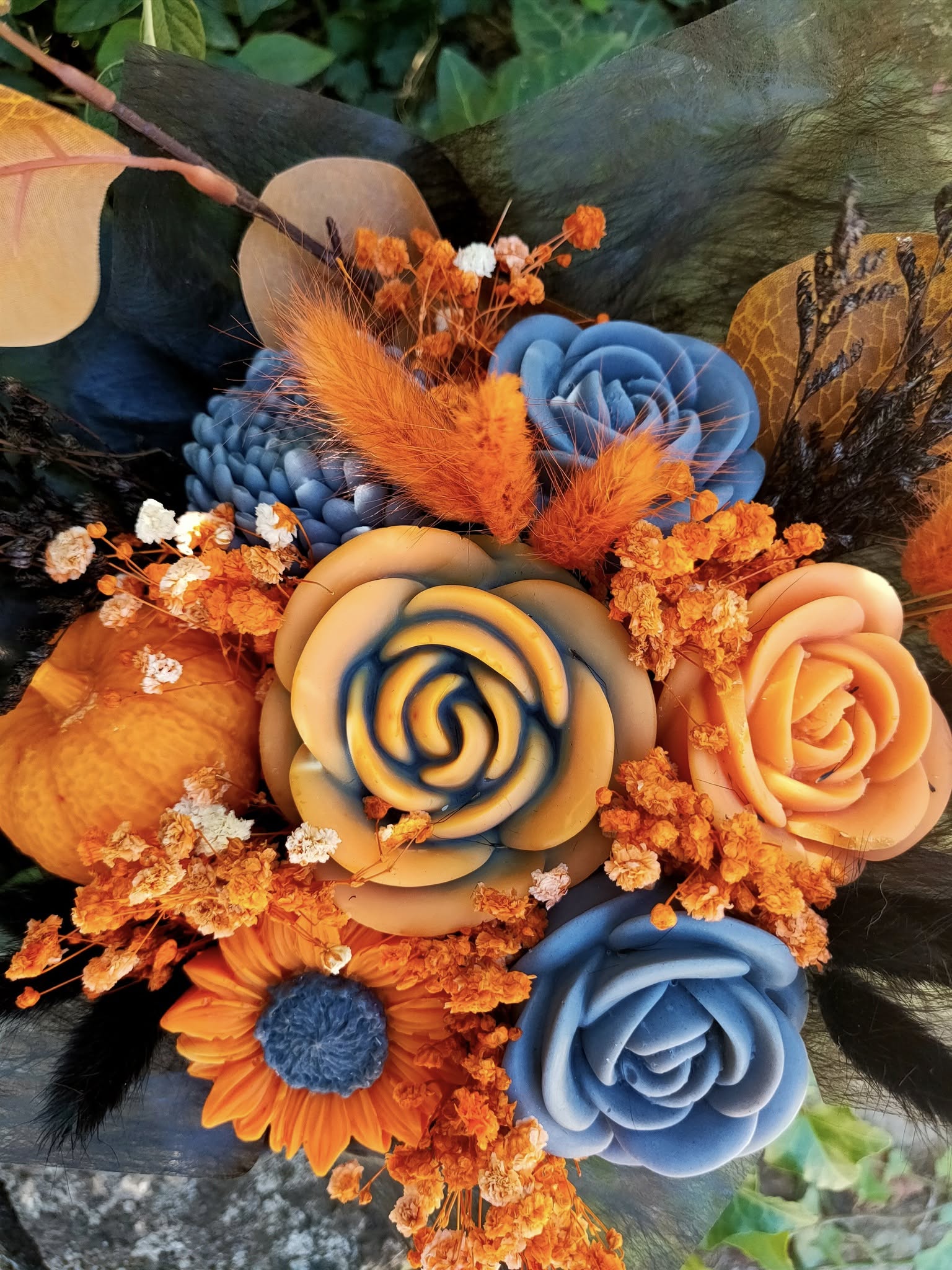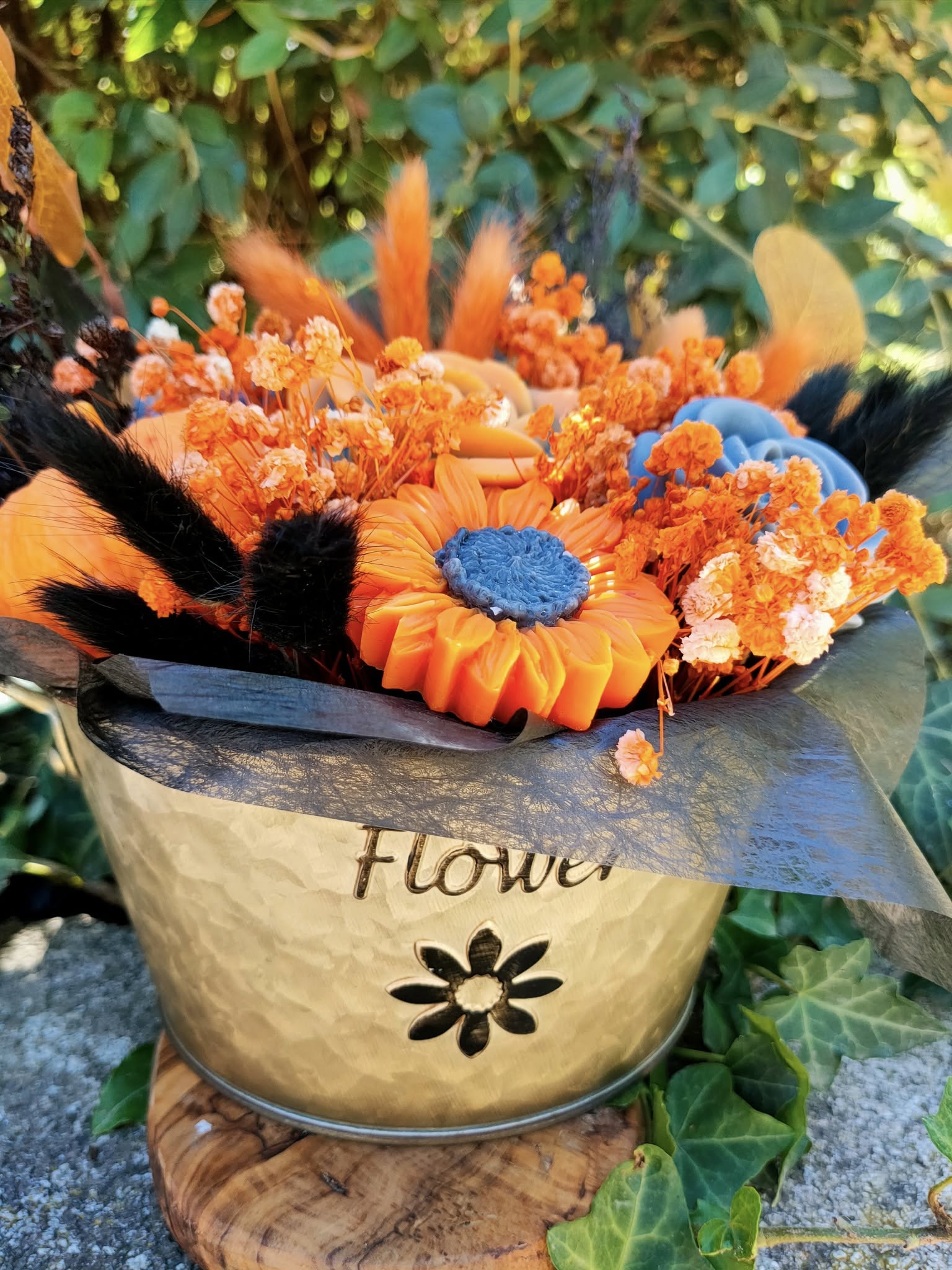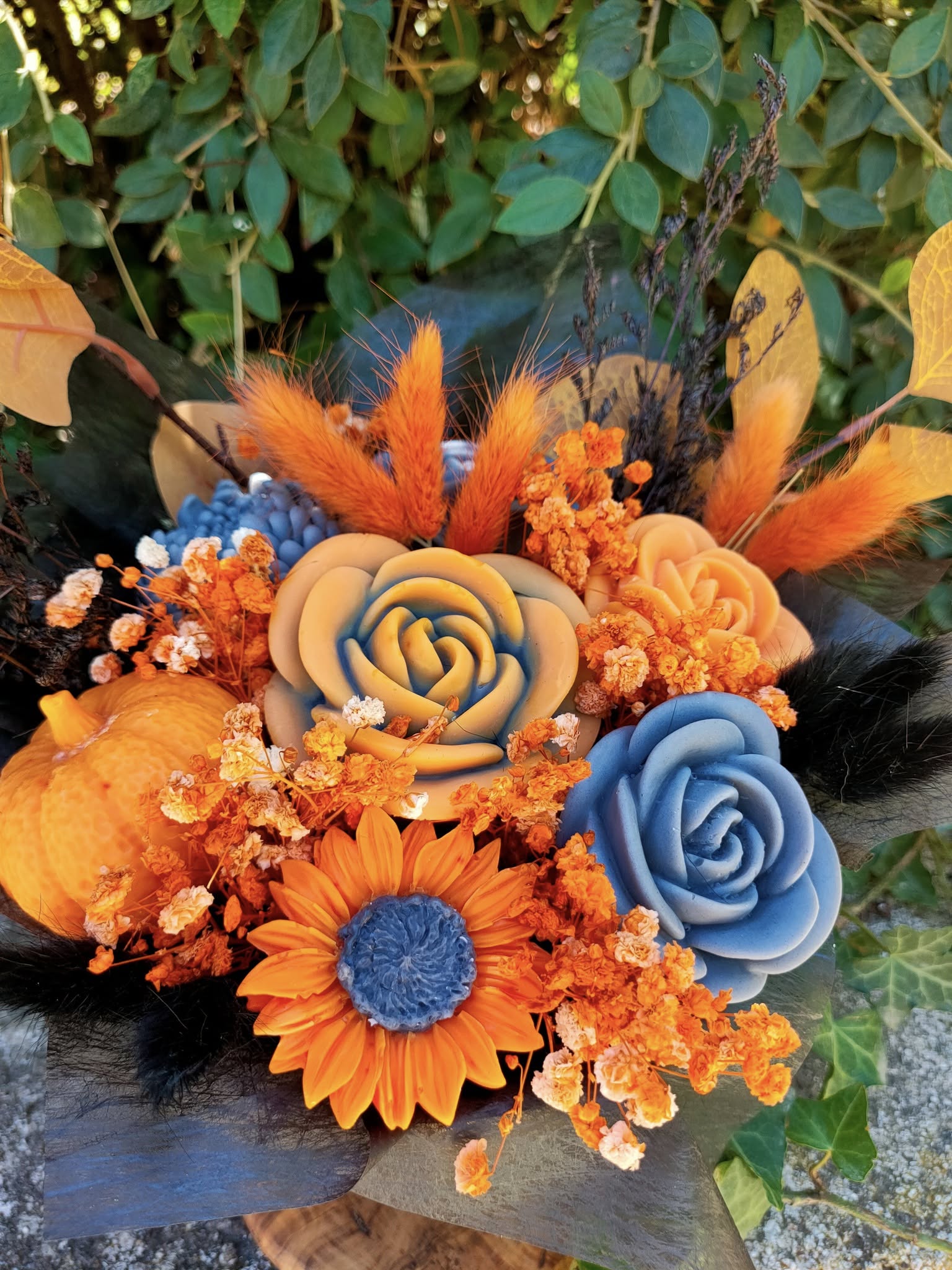 Découvrez le Bouquet Autumnus aux belles couleurs de l'automne. Un modèle unique, de fleurs parfumées à la cire végétale naturelle , entièrement fait main avec Amour. un bouquet qui ne fanera jamais, qui embellira votre intérieur tout en diffusant son parfum "Violette et Rose" pendant de longs mois, deux fleurs emblématiques, une expérience olfactive avec une élégance inégalée.