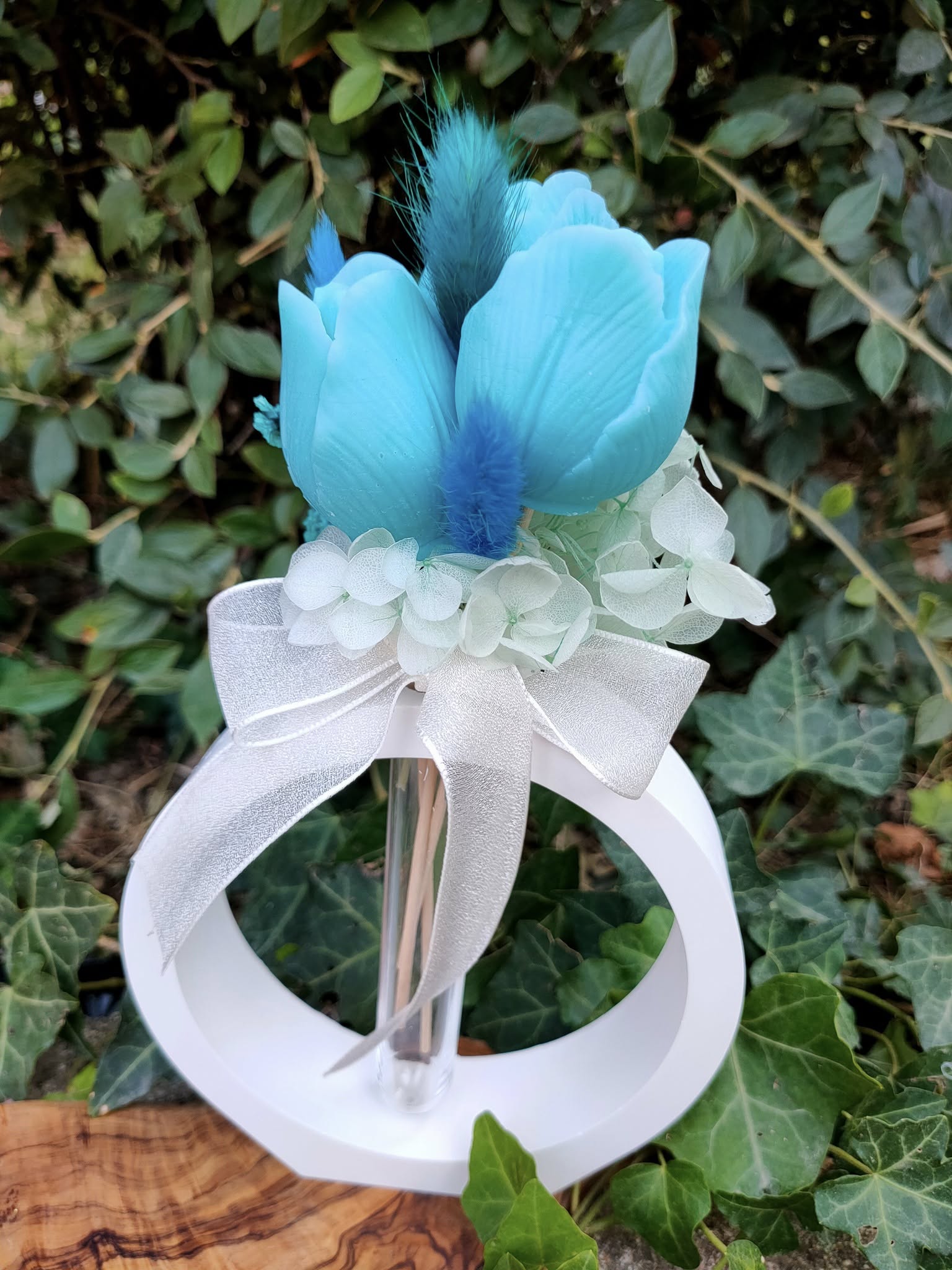 Découvrez ce bouquet de 3 tulipes en cire végétale, d'un bleu turquoise, agrémentées d'herbes de pampa et de fleurs d'hortensia, dans un vase réalisé en résine minérale naturelle, fait main avec Amour, entouré d'un joli ruban en organza blanc . Son parfum de Grasse senteur "Doux rêve" évoque une caresse douce et poudrée, il évoque des rêves doux et câlins.