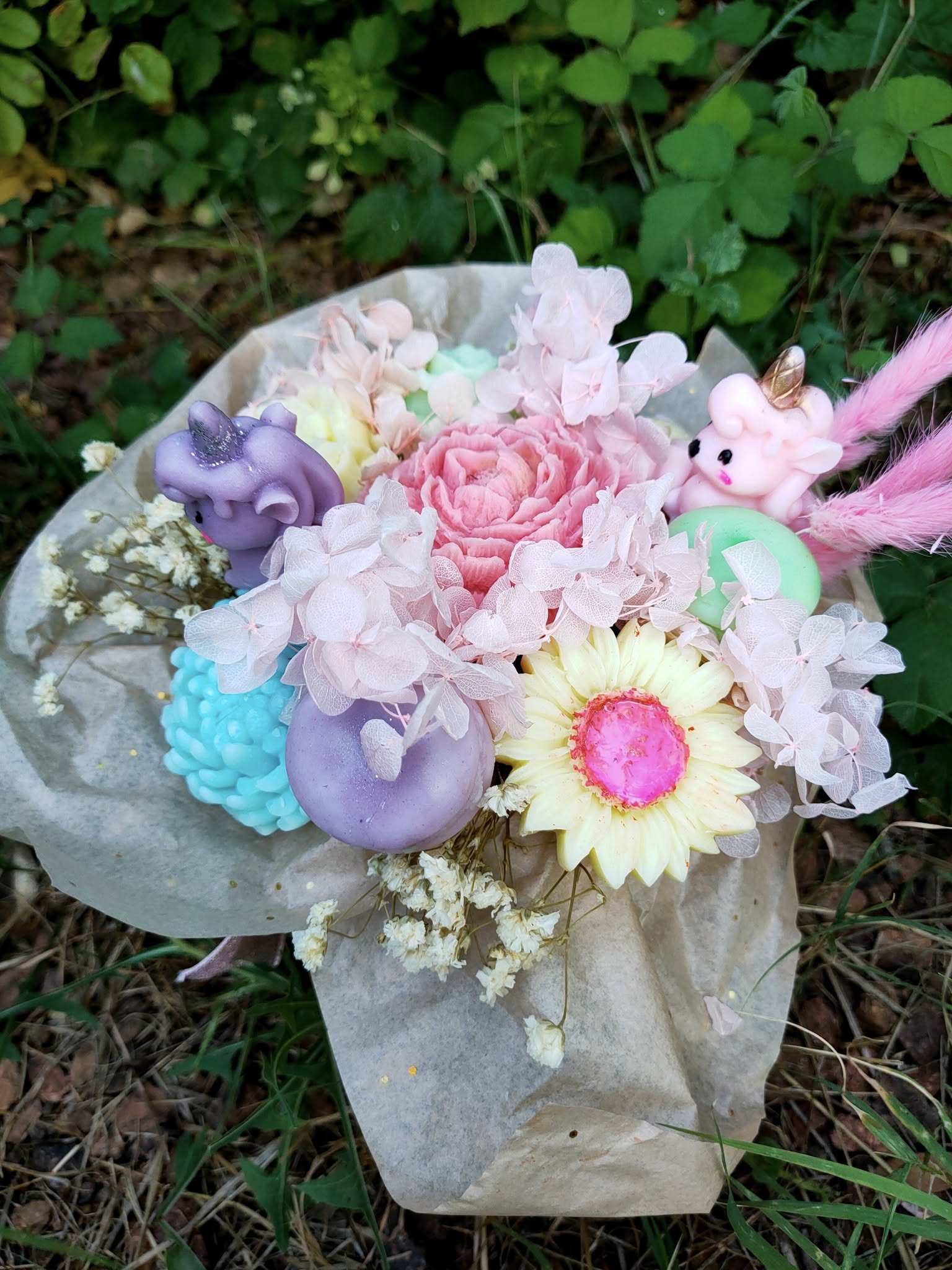 Un bouquet dans les couleurs pastelles qui exprime la joie et la douceur des moments féériques. Réalisé en cire d'olive végétale, au parfum de grasse senteur "Licorne féérique". Une invitation a s'évader dans un univers magique, où chaque note raconte une histoire de douceur , de rêves et d'émerveillement