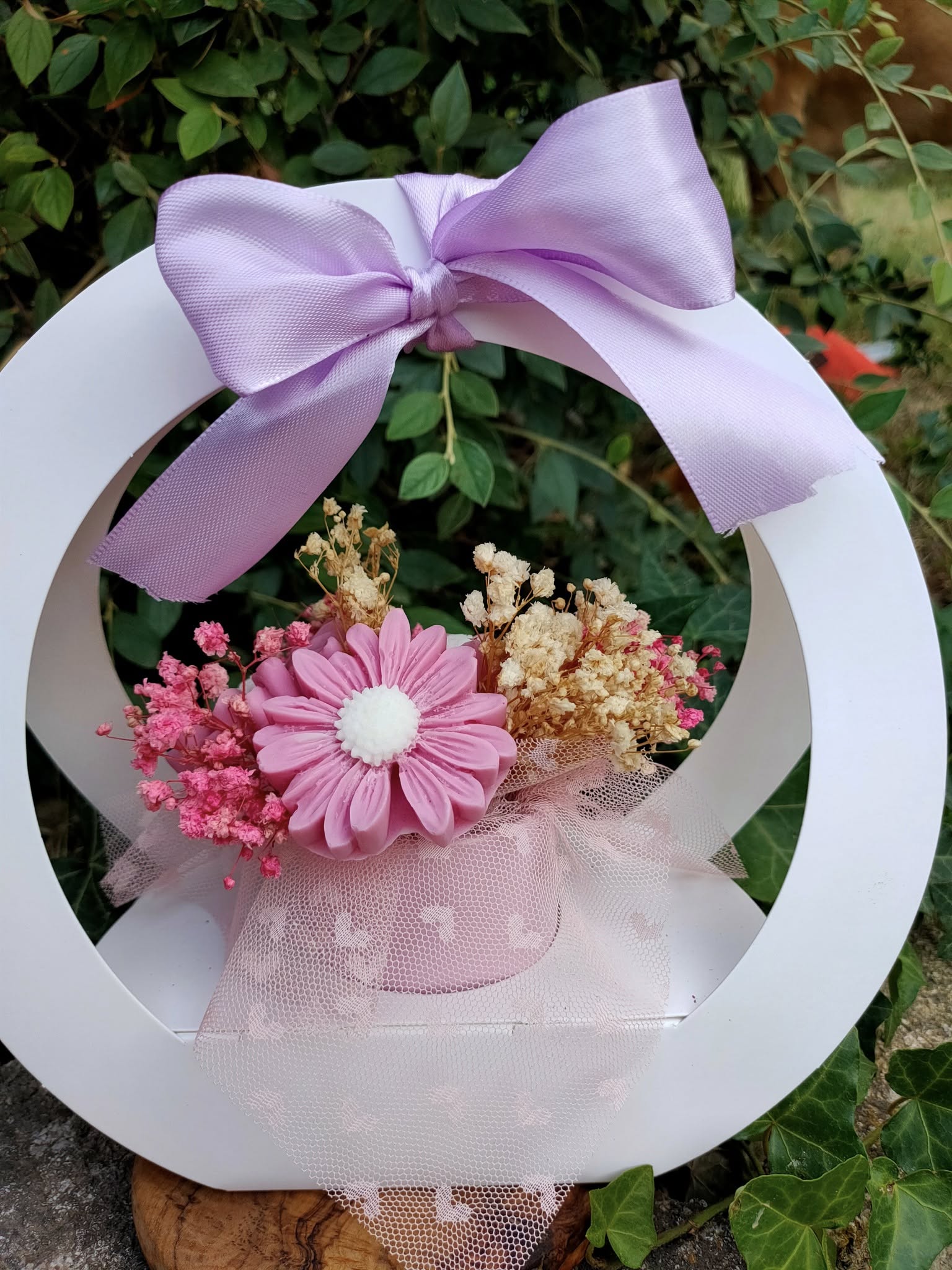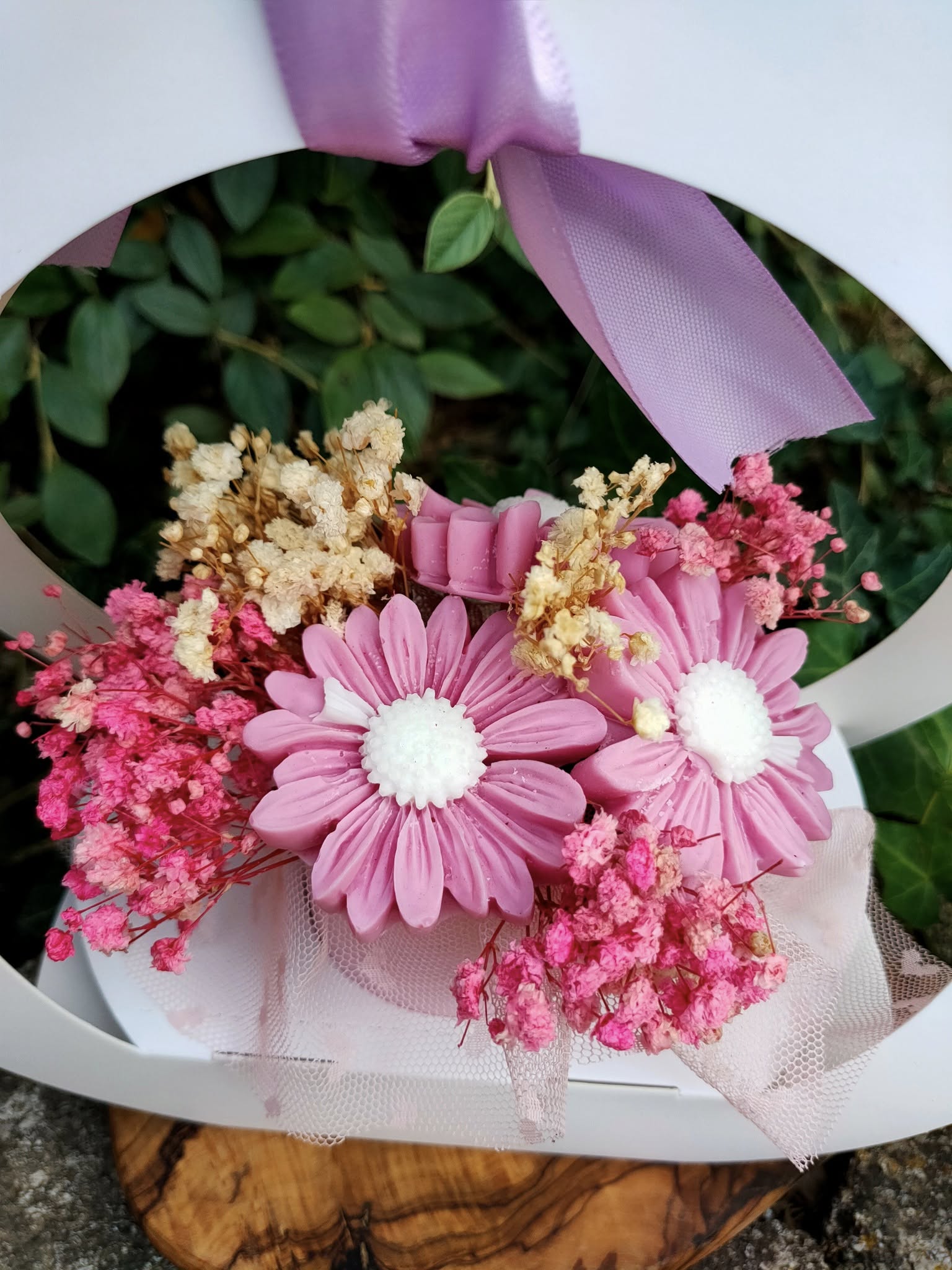 Un joli petit bouquet de pâquerettes réalisé à la main, symbole d'innocence et d'amour , en cire végétale, agrémenté de fleurs séchées dans sa boite cadeau . un modèle unique au parfum "lavande" une fragrance apaisante , une pause douceur au milieu du brouhaha . une bulle de bien être et de plénitude.
