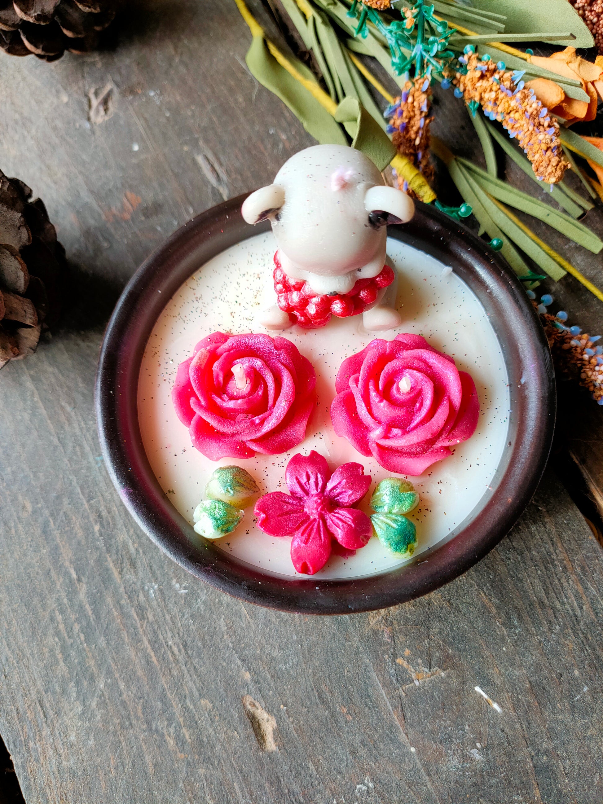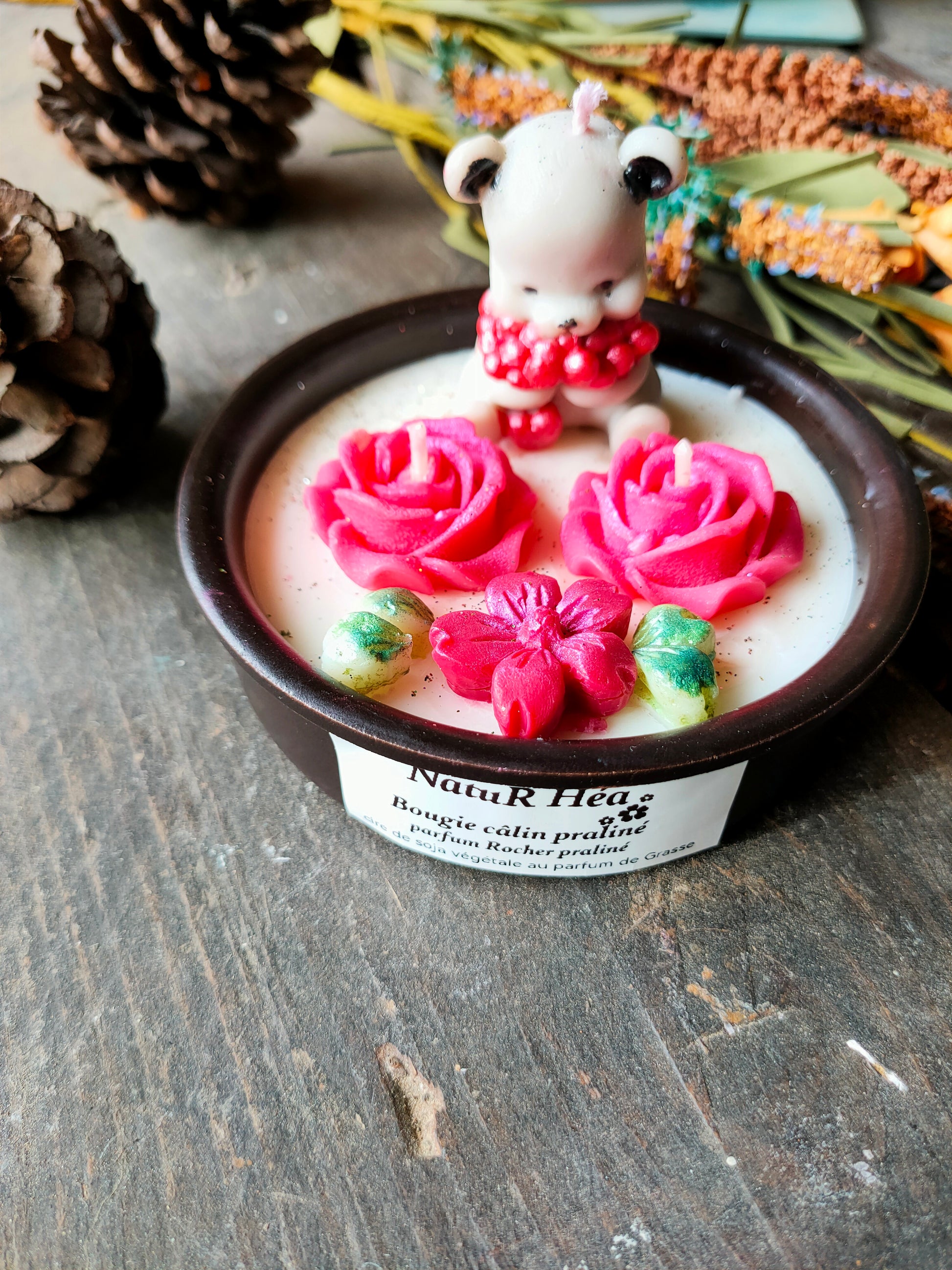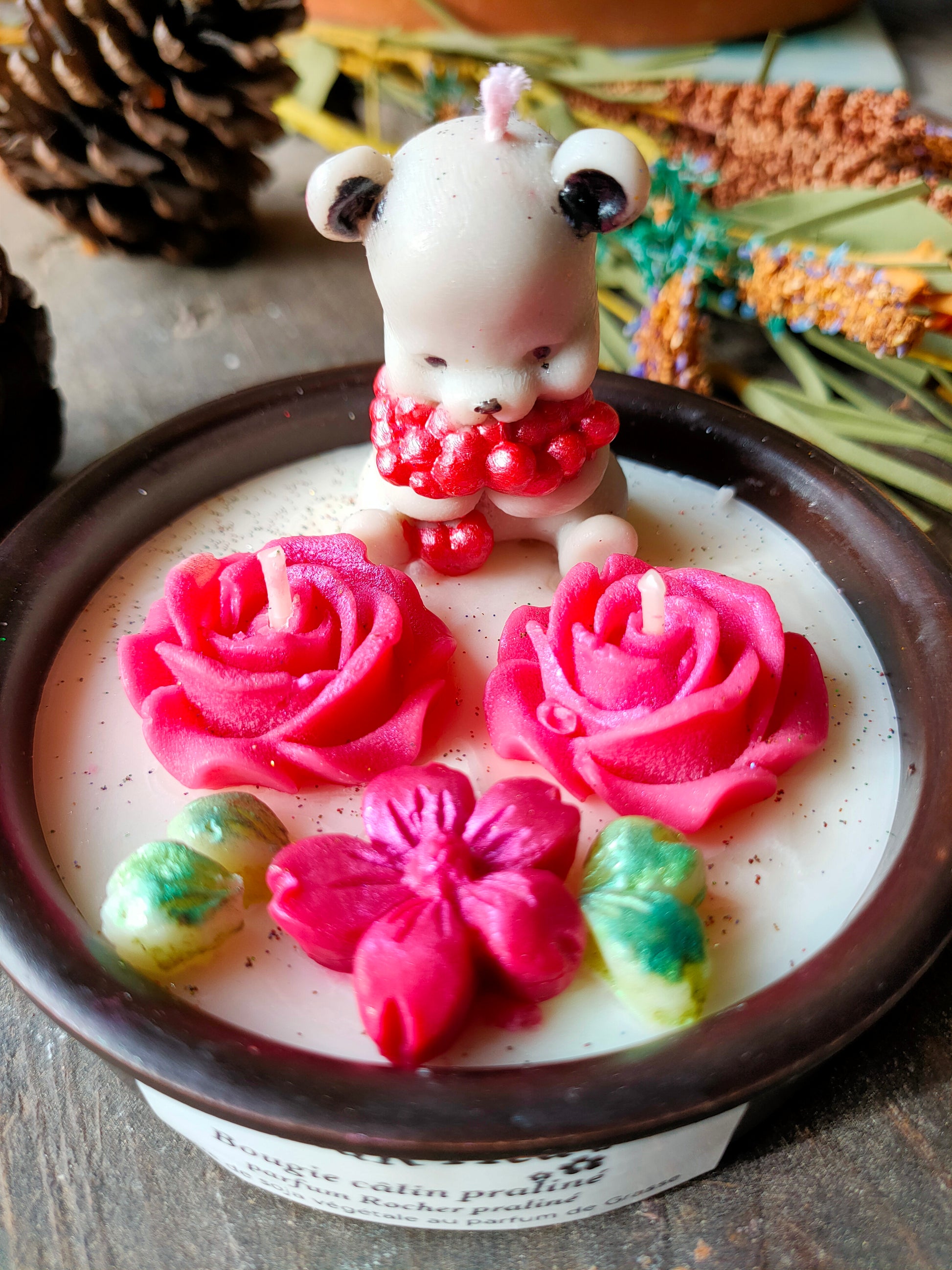 Ornée de fleurs délicates et d'un petit ourson plein de tendresse, cette création est entièrement réalisée à la main dans mon atelier du sud, en cire végétale soigneusement sélectionnée.