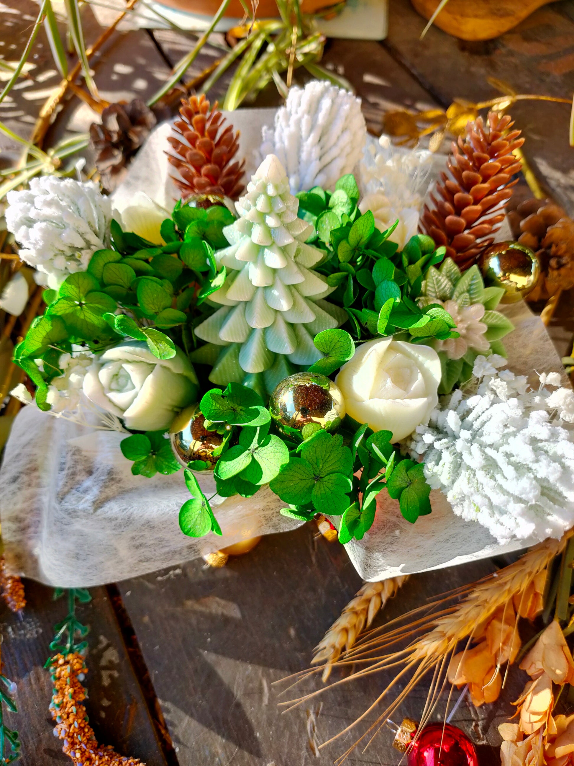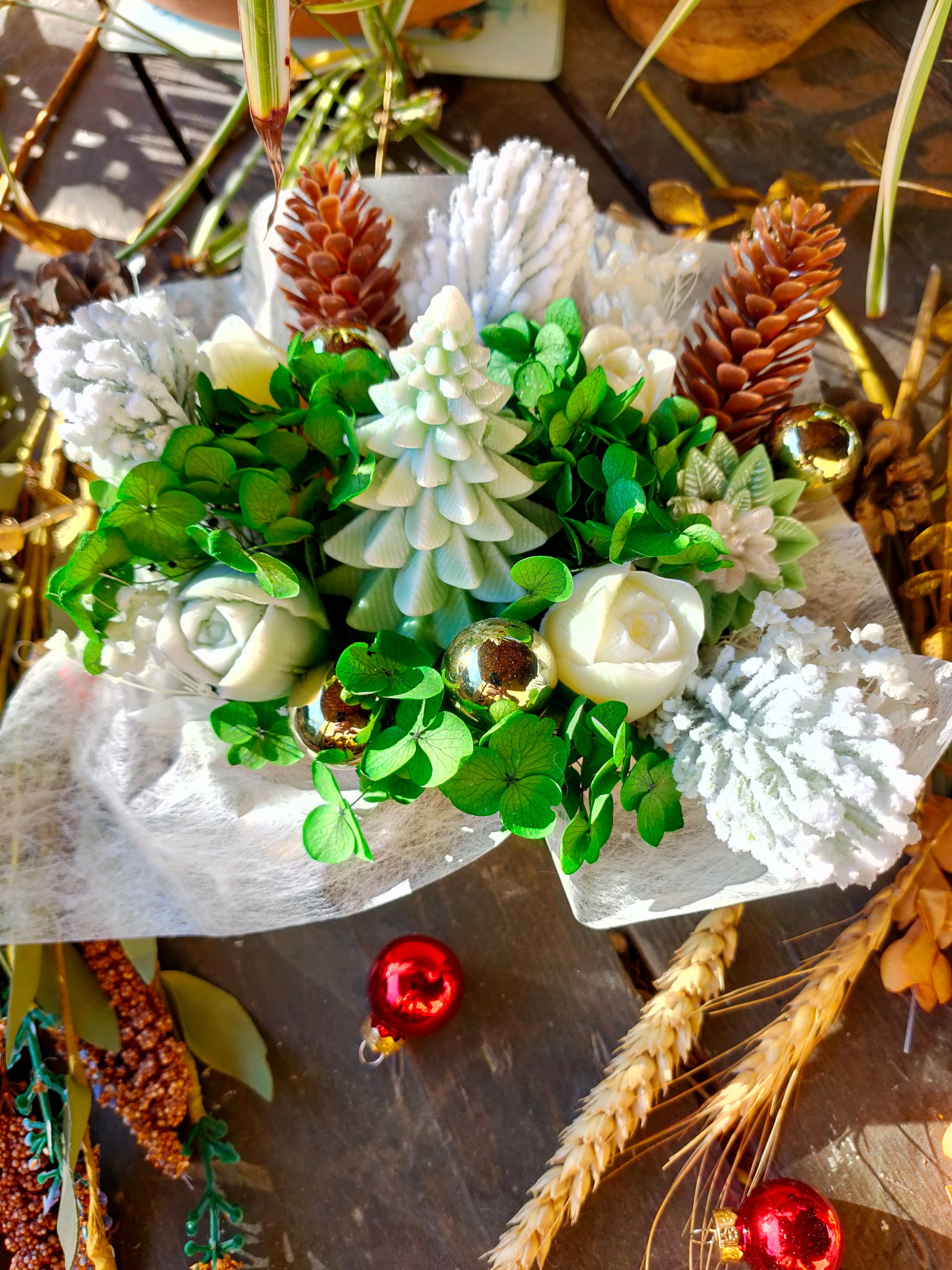 Laissez vous séduire par le bouquet Forêt Gourmande , une création lumineuse et délicate qui capture toute la magie d'un sous bois enneigé. Au cœur du bouquet trône un sapin en cire végétale, entouré d'un mélange harmonieux de feuillages verts, de fleurs blanches et de pommes de pin délicatement givrées.