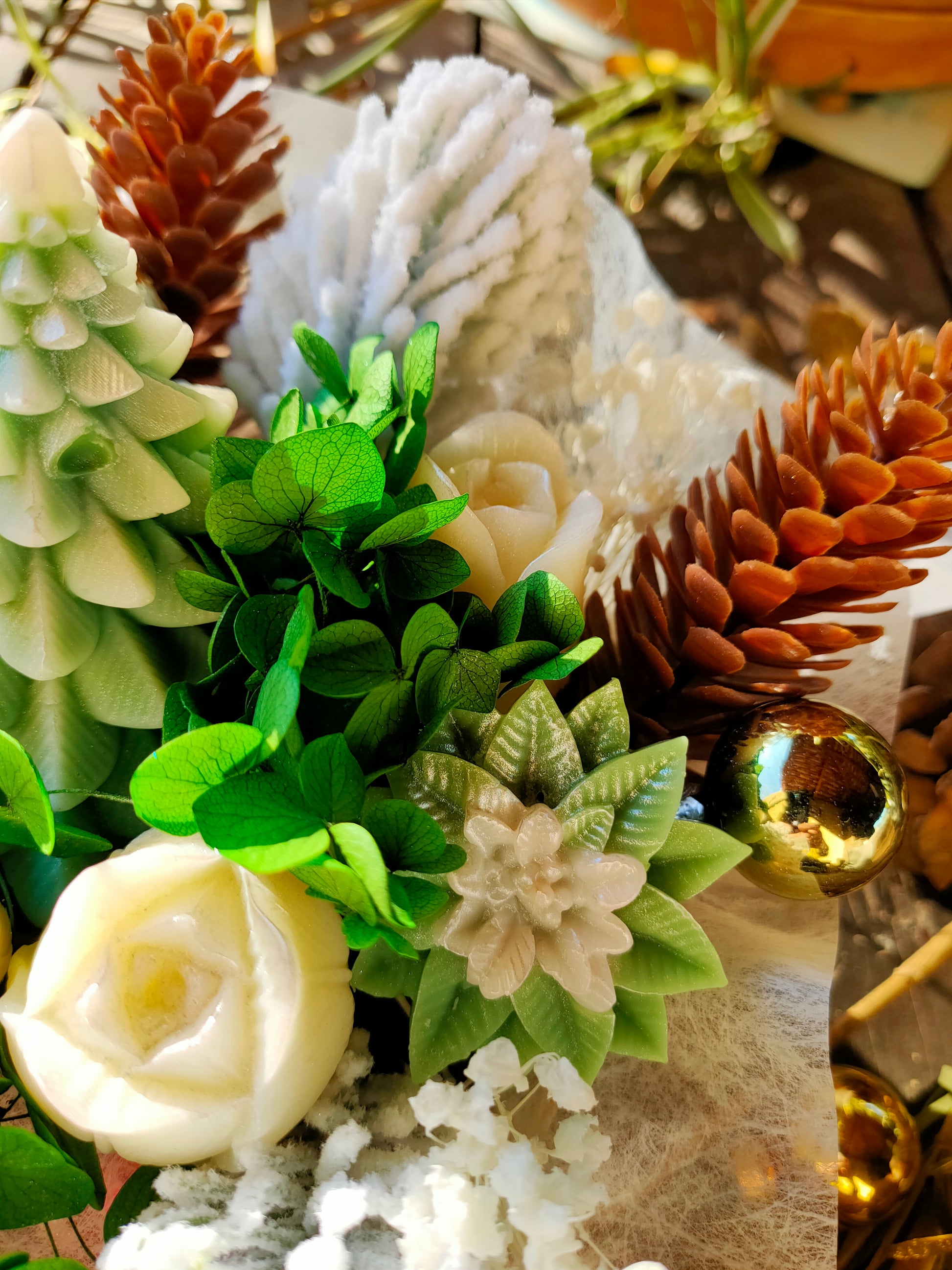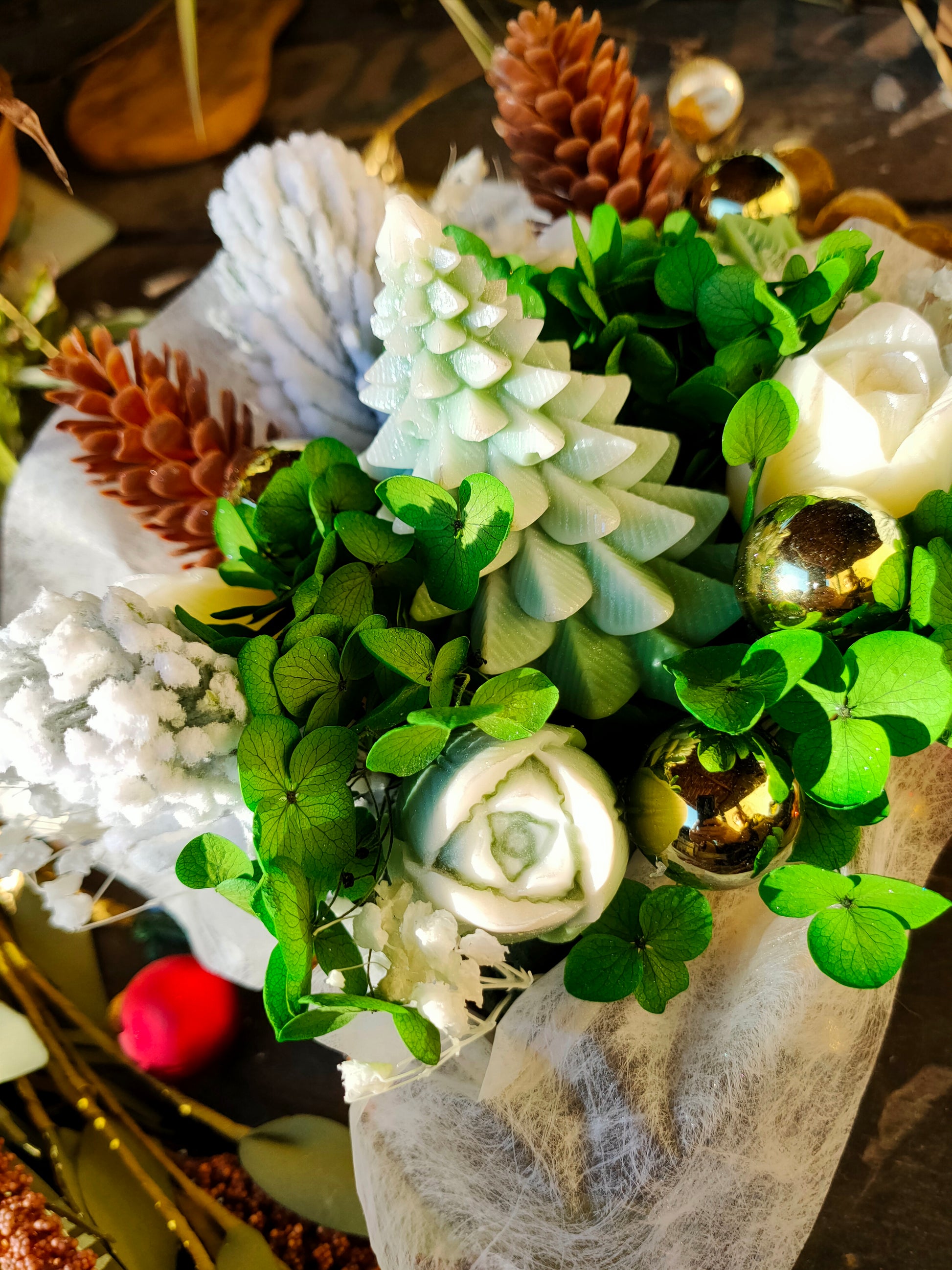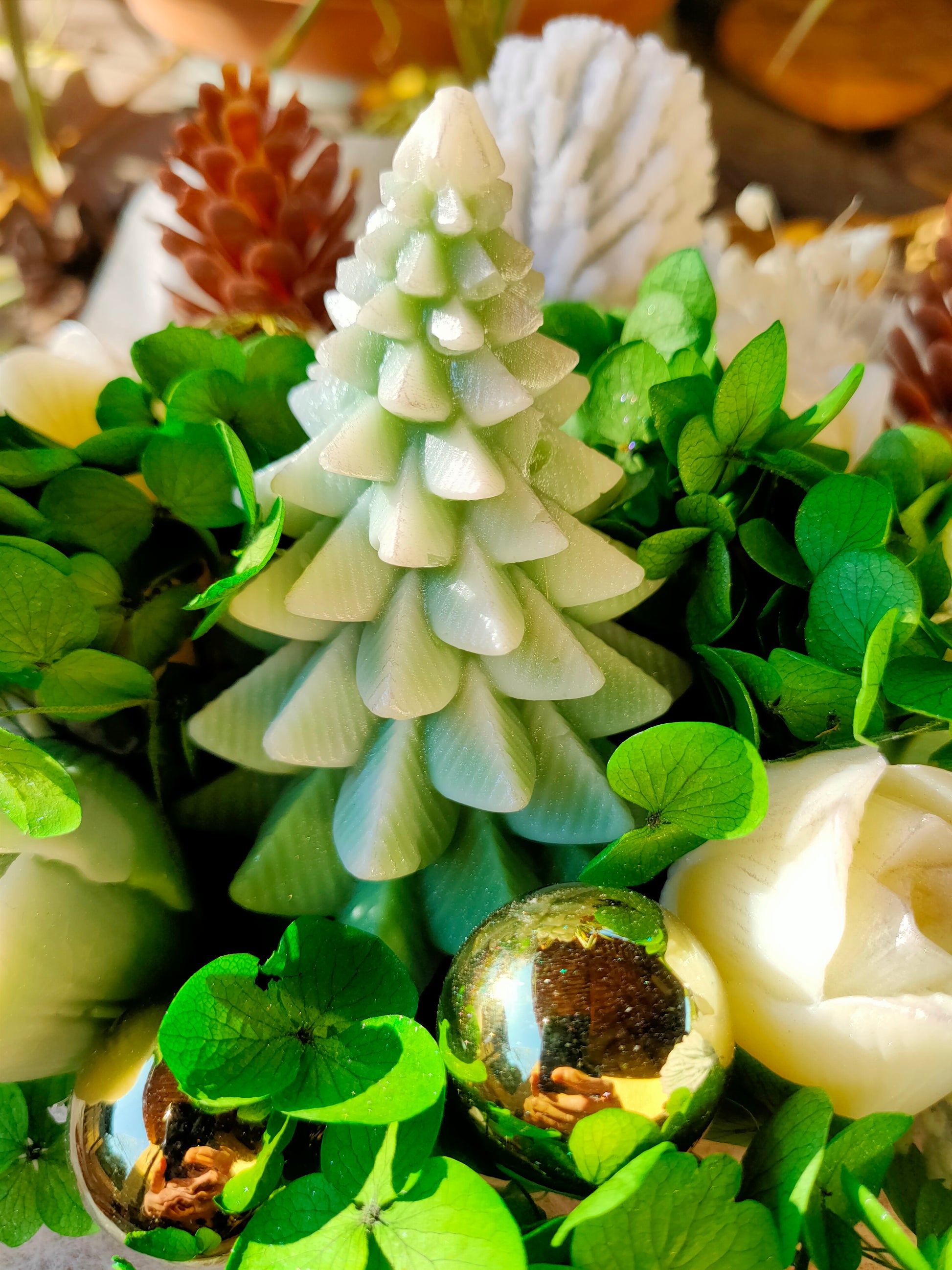 - Fleurs et sapin en cire d'olive végétale de haute qualité, sans OGM, 100% naturelle, végétalien, biodégradable, sans produits dérivés du palmier, sans paraffine, non testé sur les animaux (cruelty-free)