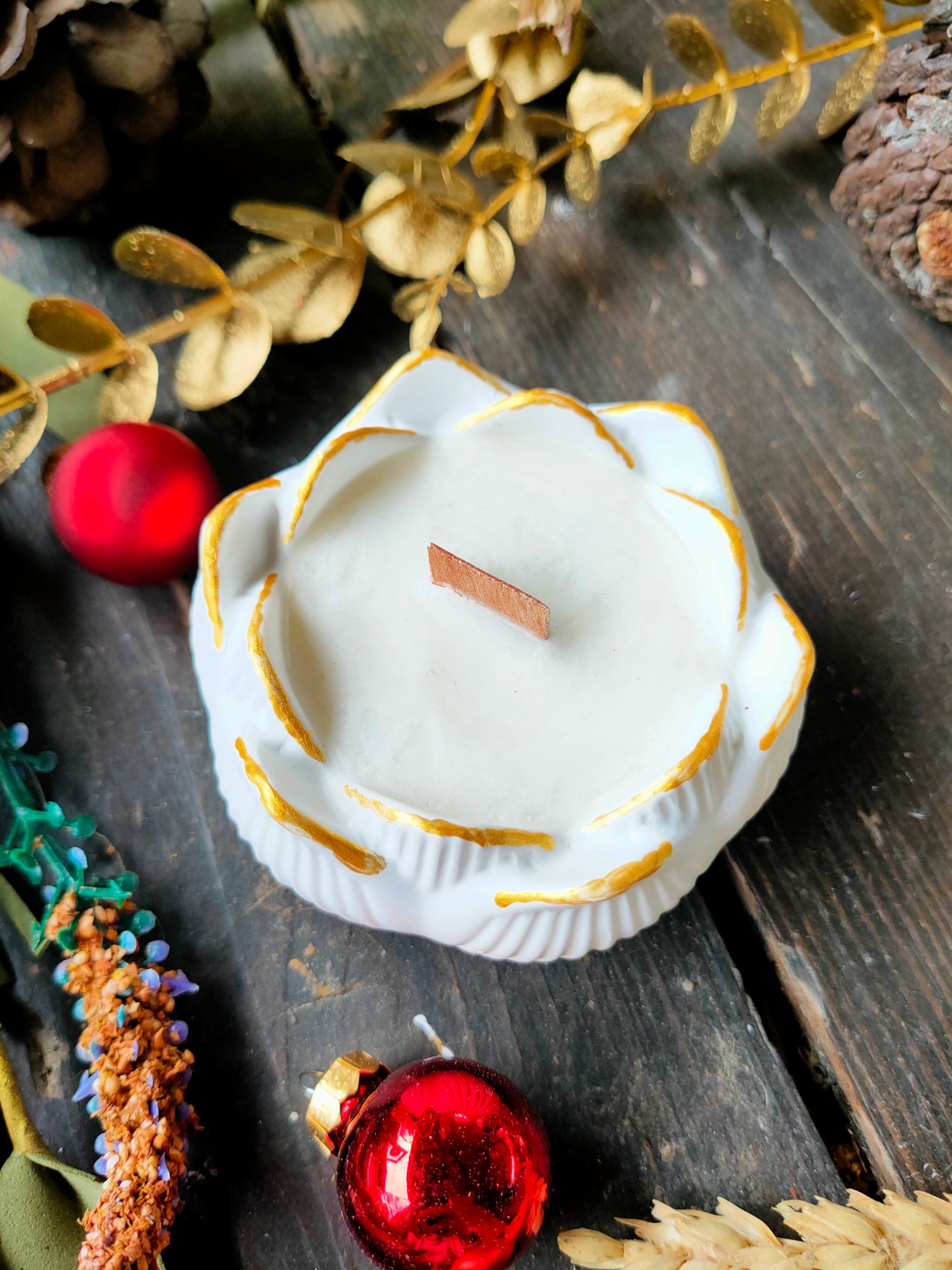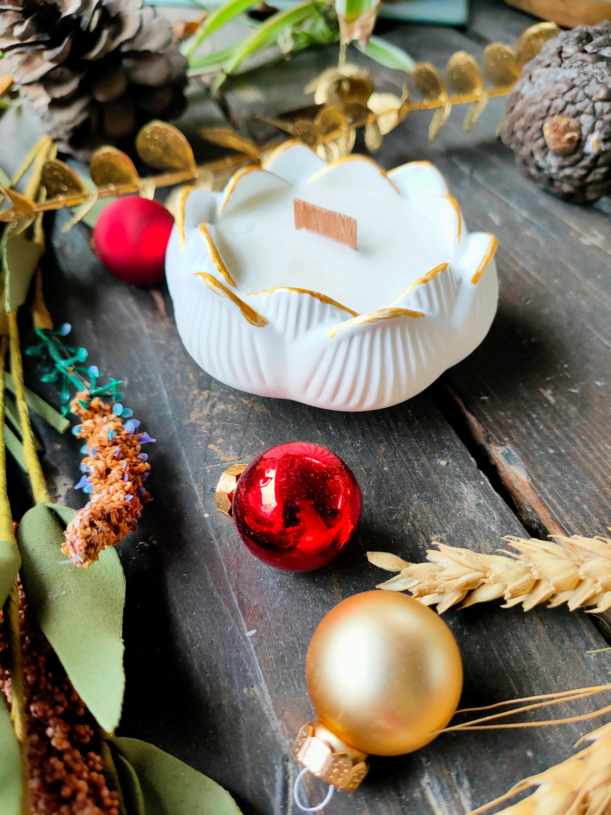 Plongez dans une ambiance chaleureuse et réconfortante grâce à Lumière d'Epice, une bougie délicatement coulée dans son superbe lotus blanc orné d'Or. Son parfum Pain d'épices, gourmand et épicé, mêle cannelle, miel et douce vanille, Une fragrance chaleureuse qui rappelle immédiatement les fêtes, les moments cocooning et la magie des soirées d'hiver.