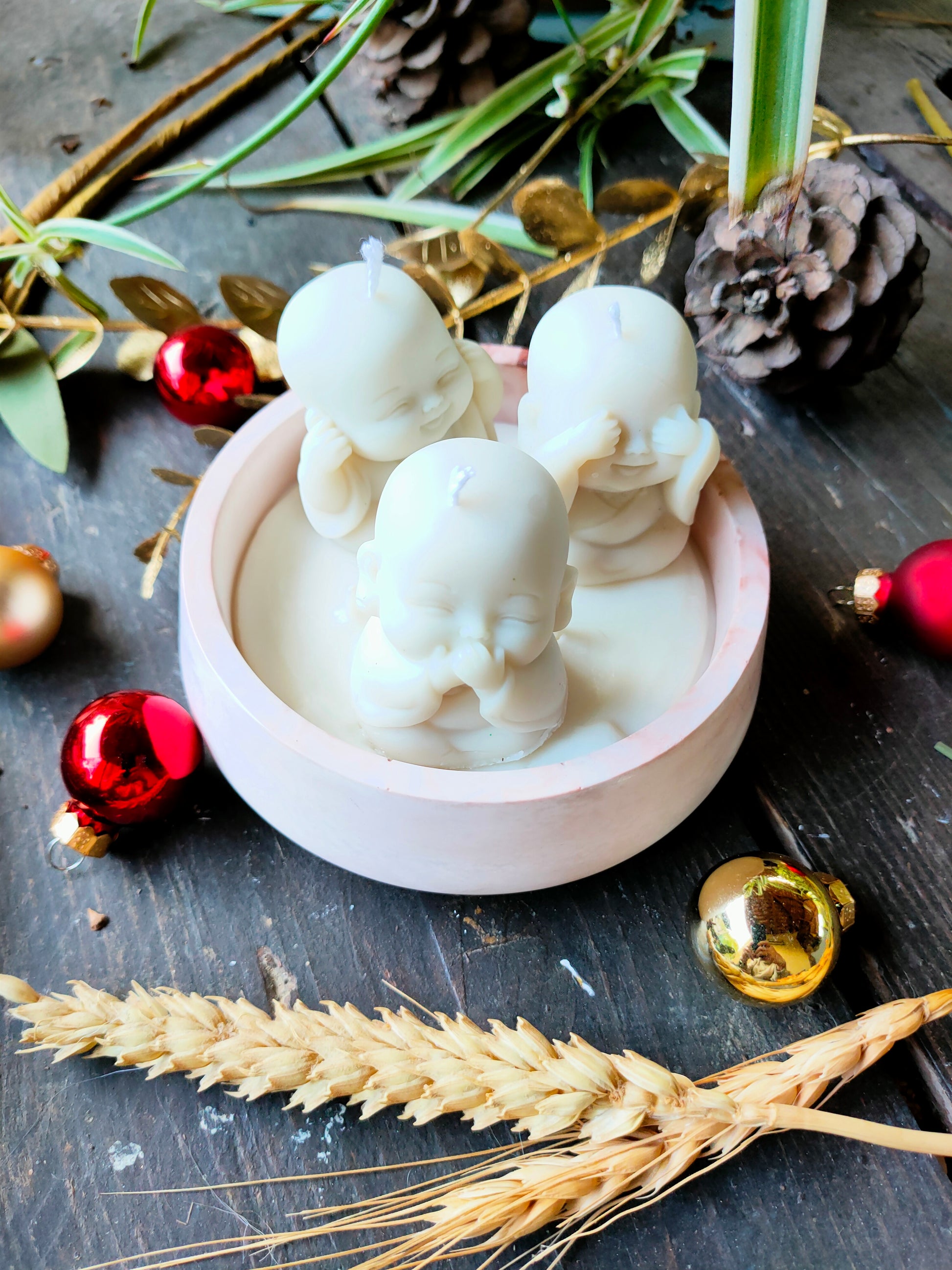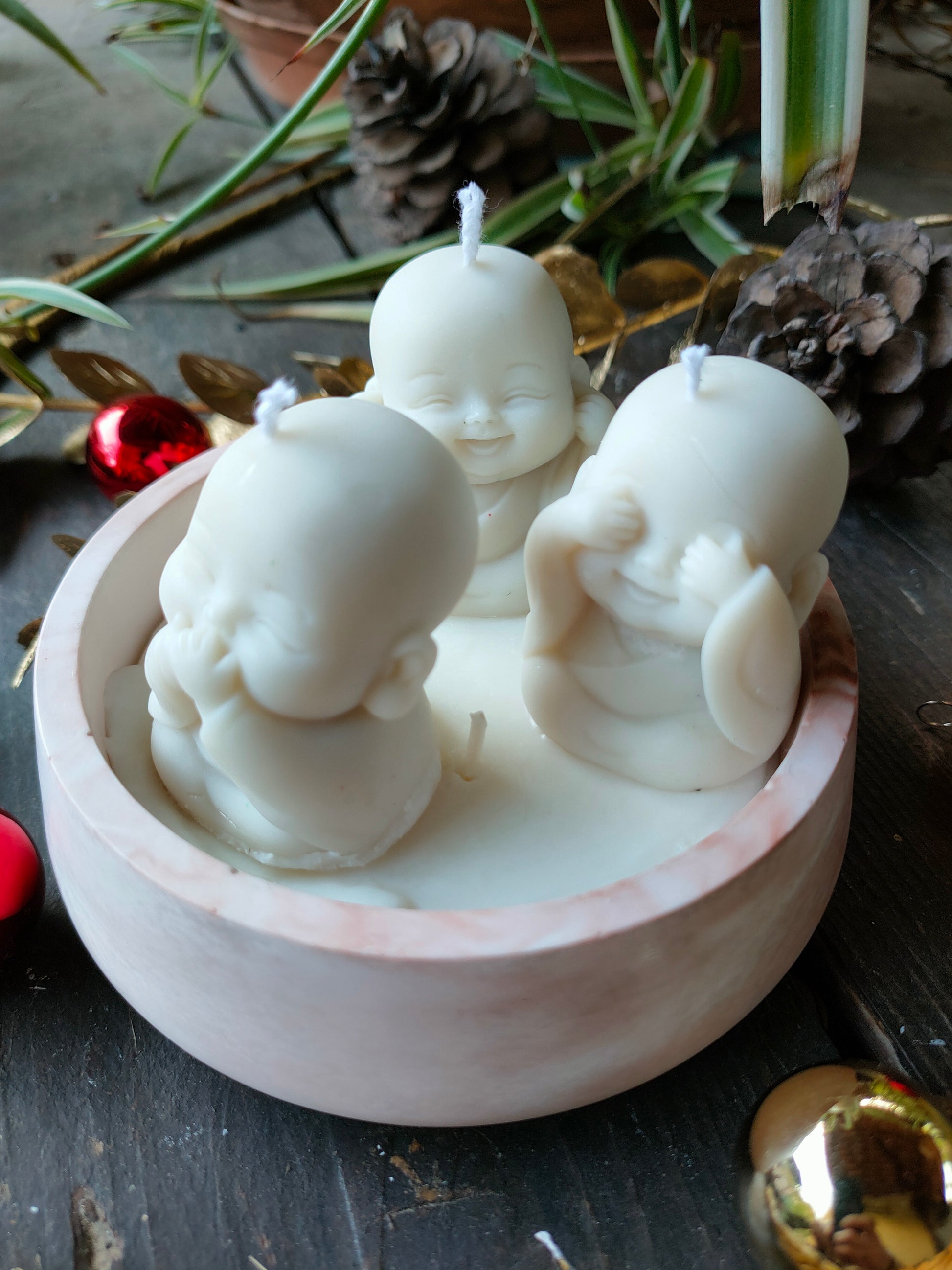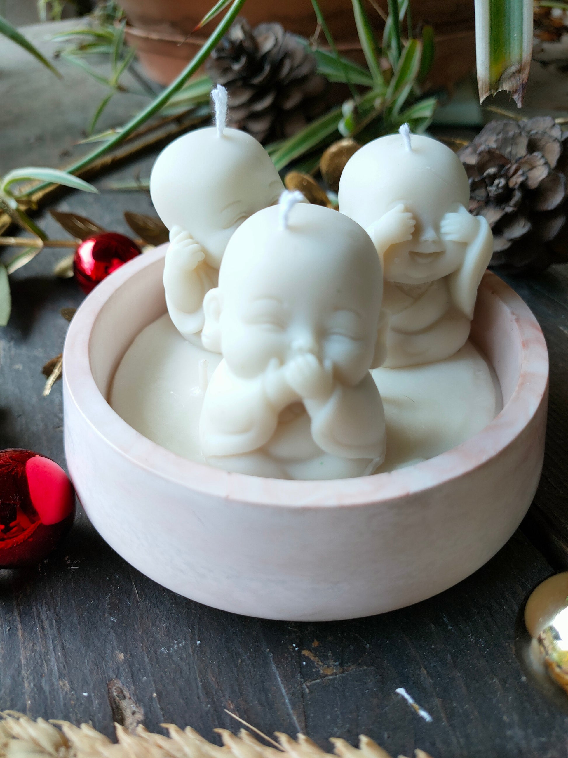 Symbole de paix intérieure et de sérénité, cette bougie artisanale représente les trois Bouddhas de la sagesse : Rien ne voir, ne rien dire, ne rien entendre. Coulée à la main dans un pot en résine au design épuré, elle diffuse la douce fragrance Doux Rêves, un parfum apaisant et enveloppant qui invite au calme et à la méditation.