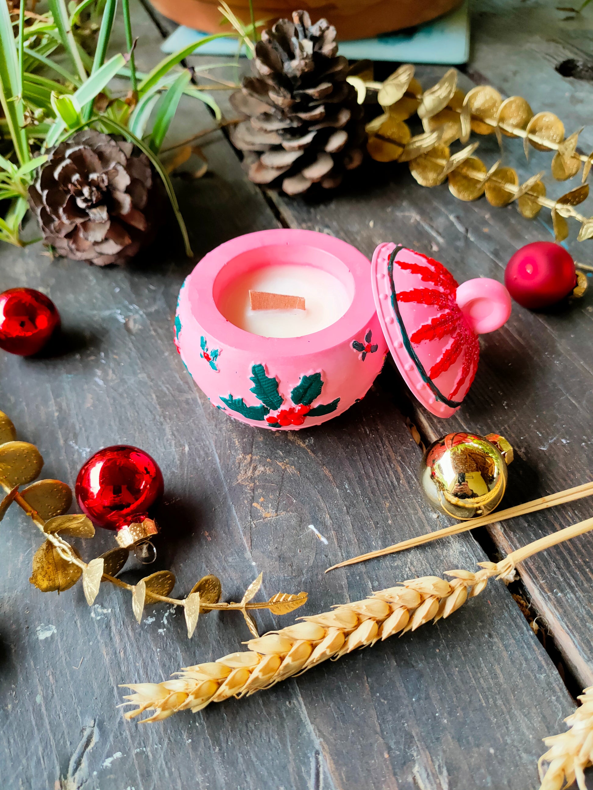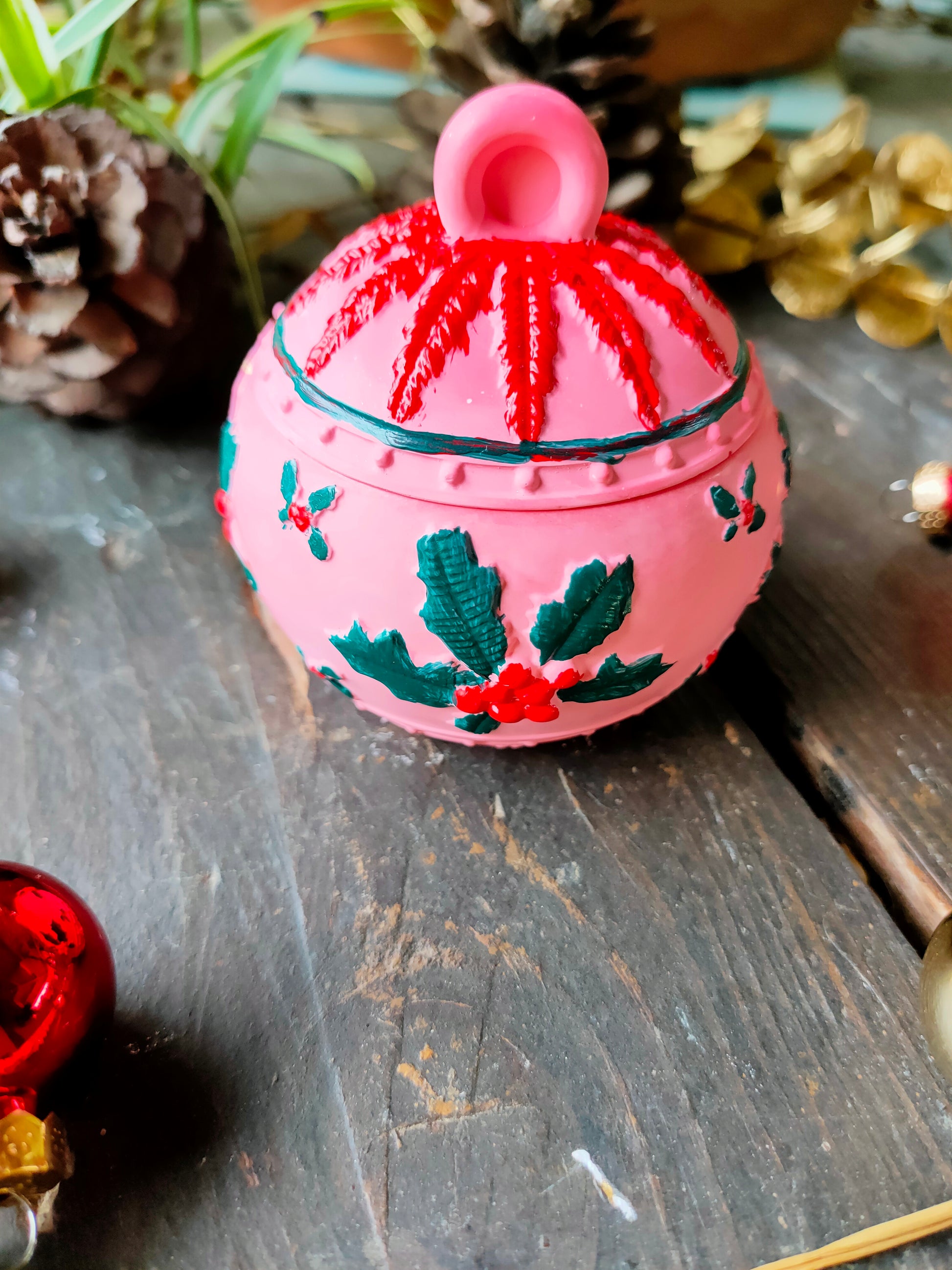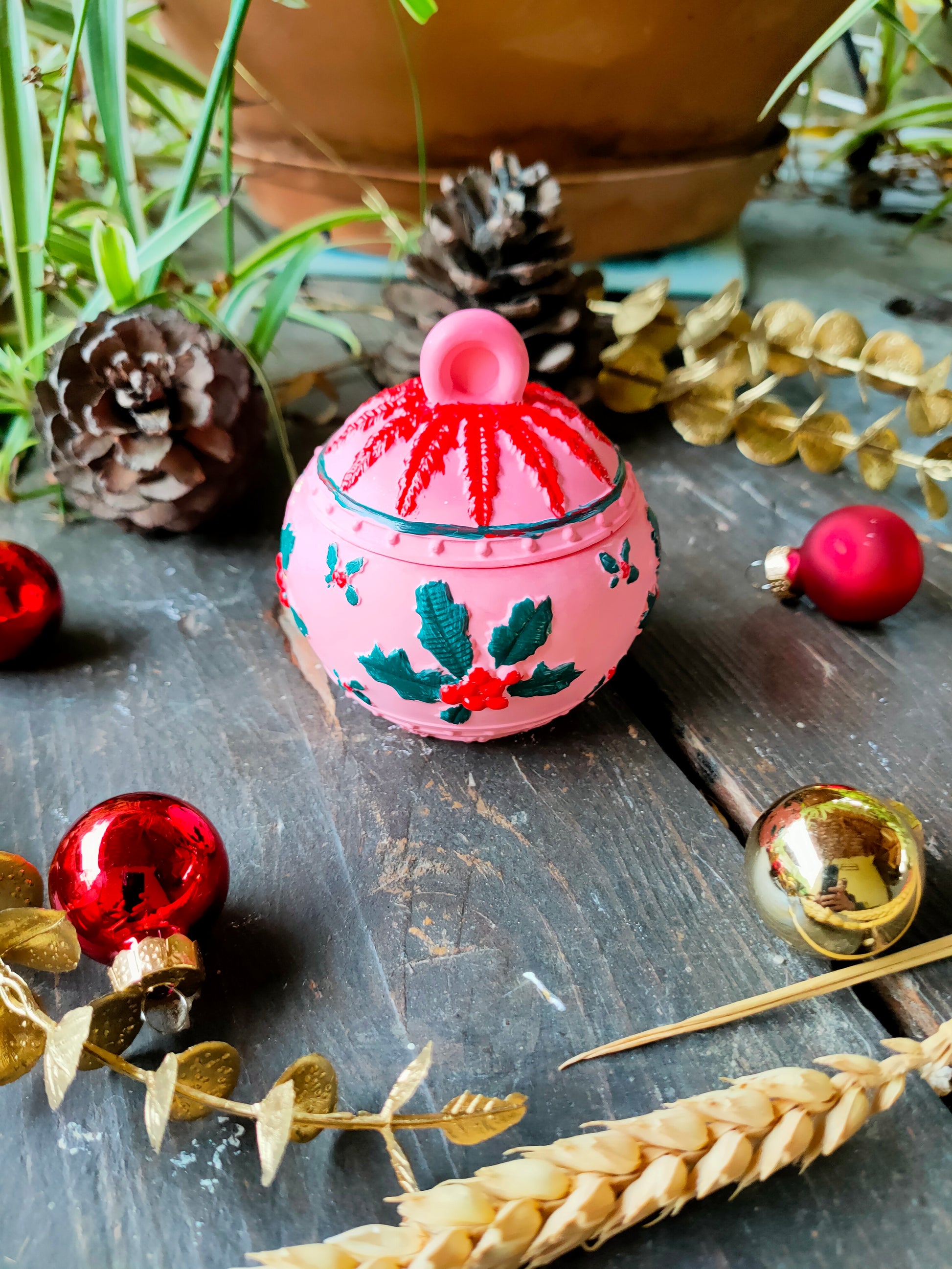 Son couvercle orné de motifs de houx et de baie rouges en fait un petit bijou de saison.